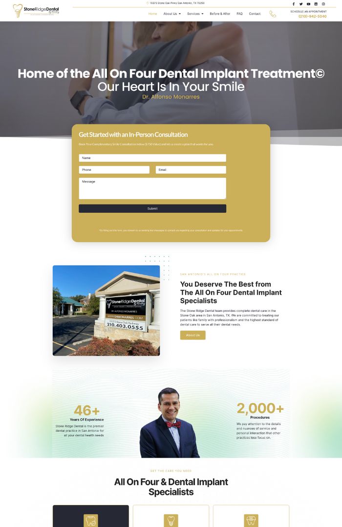 Stone Ridge Dental is a specialty dental office based out of San Antonio, TX. When DentalNation took over, they helped to shape the brand of Stone Ridge around Dr. Alfonso Monarres. They have now been featured in television commercials, in television programs, and also have increased their dental implants business.